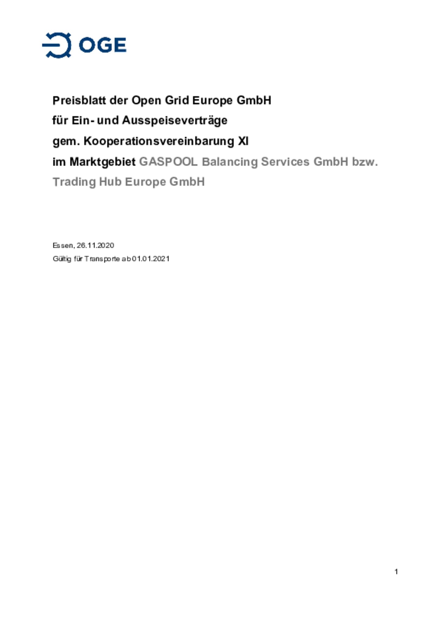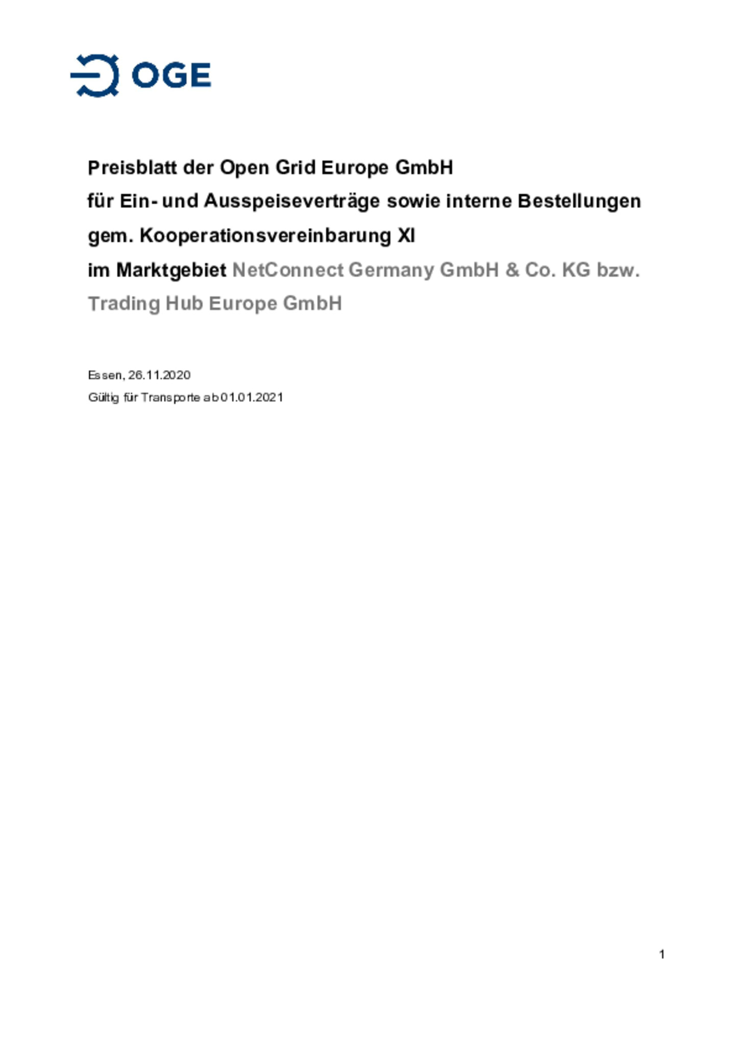 Preisblatt der Open Grid Europe GmbH für Ein- und Ausspeiseverträge sowie interne Bestellungen gem. Kooperationsvereinbarung XI im Marktgebiet NetConnect Germany GmbH & Co. KG bzw. Trading Hub Europe GmbH
