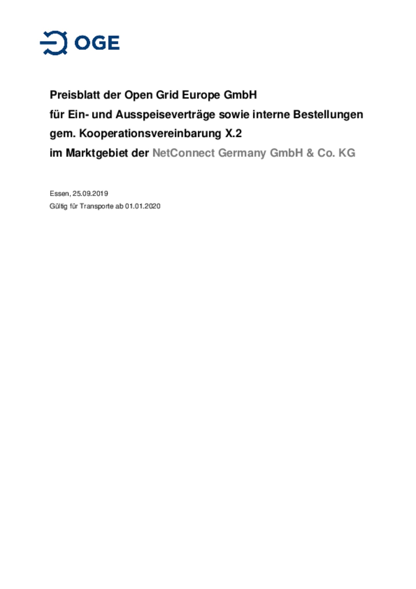 Preisblatt der Open Grid Europe GmbH für Ein- und Ausspeiseverträge sowie interne Bestellungen gem. Kooperationsvereinbarung X.2 im Marktgebiet der NetConnect Germany GmbH & Co. KG