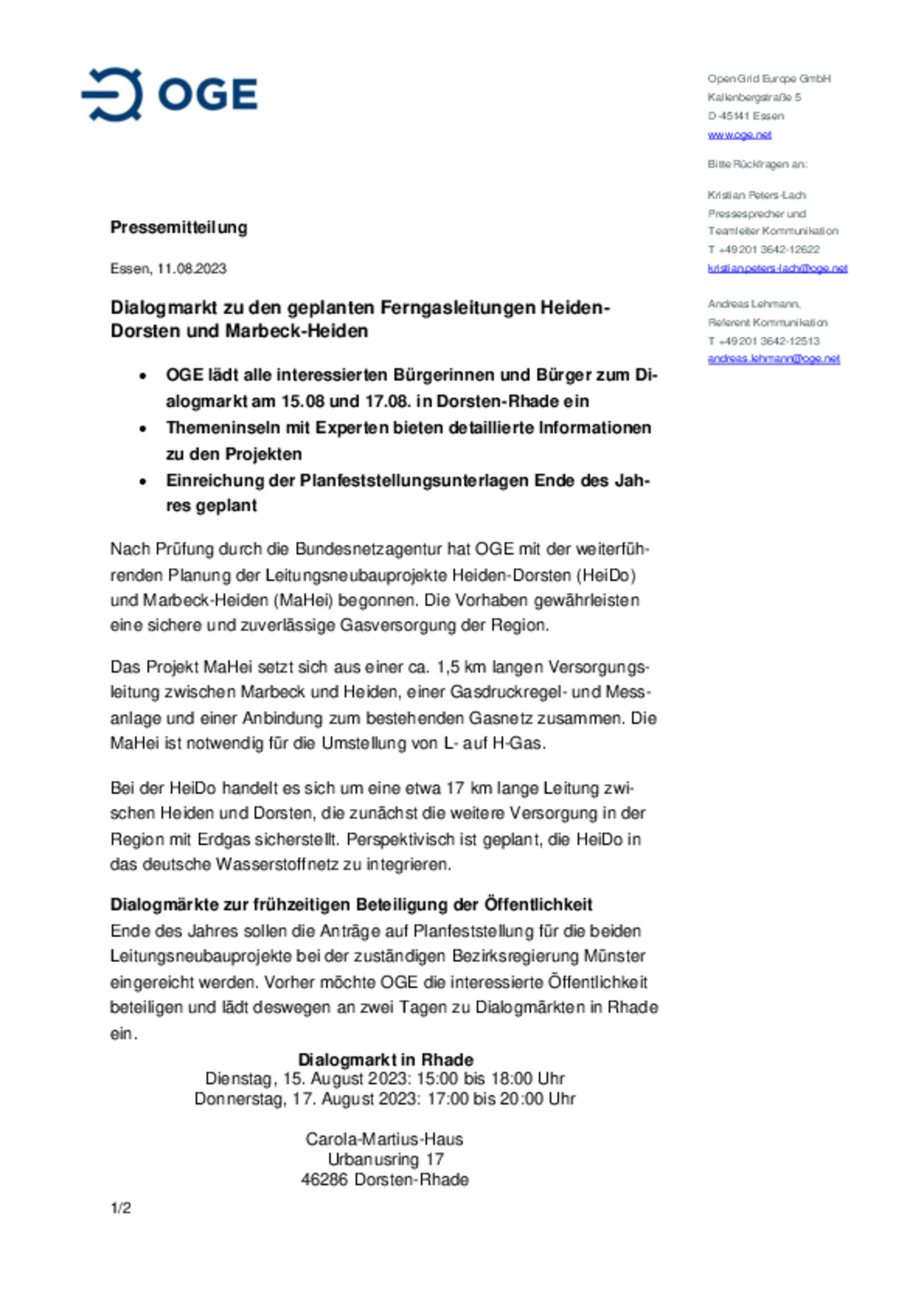 OGE lädt alle interessierten Bürgerinnen und Bürger zum Dialogmarkt am 15.08. und 17.08.2023 in Dorsten-Rhade ein. Themeninseln mit Experten bieten detaillierte Informationen zu den Projekten. …Einreichung der Planfeststellungsunterlagen Ende des Jahres geplant.