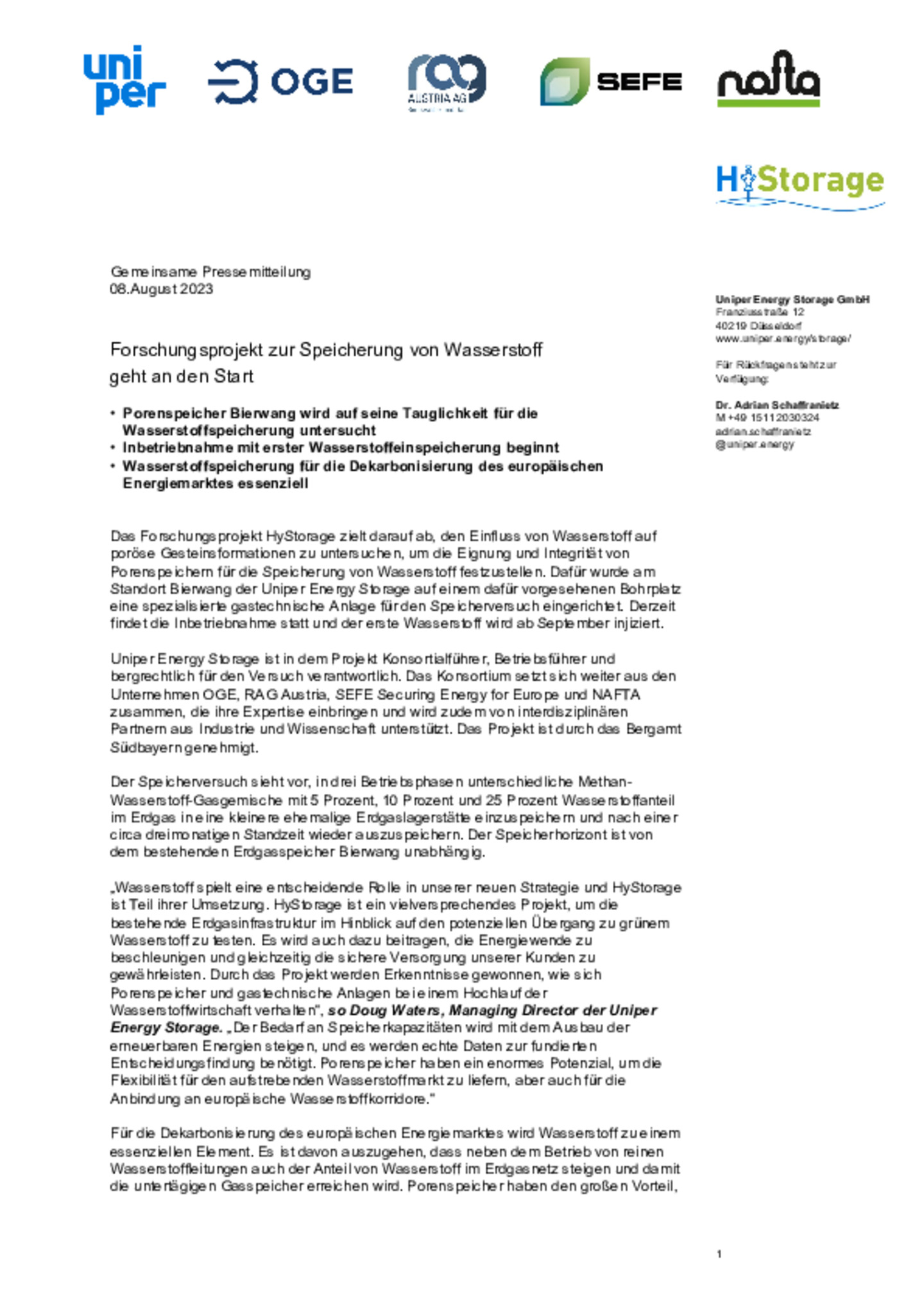 Porenspeicher Bierwang wird auf seine Tauglichkeit für die Wasserstoffspeicherung untersucht. Inbetriebnahme mit erster Wasserstoffeinspeicherung beginnt. Wasserstoffspeicherung für die …Dekarbonisierung des europäischen Energiemarktes essenziell.