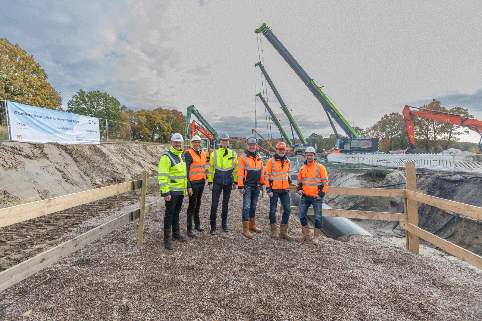 Die EWA bildet den 60 km langen Leitungsabschnitt der Erdgasversorgungslei­tung Etzel-Wardenburg-Drohne, die die Versorgung von Deutschland mit Erd­gas sichern soll. Sie schließt an die bereits fertiggestellte Wilhelmshavener-An­bindungsleitung (WAL) an und soll zukünftig die Erdgasmengen aus den nördli­chen Regionen transportieren. Beginnend in Etzel und in weitestgehender Parallellage zur Gasversorgungsleitung Norddeutsche Erdgas-Transversale (NETRA) verlaufend, mündet die EWA in Wardenburg in die dortige NETRA­Verdichterstation Wardenburg ein. Für die Leitung, die einen Rohrdurchmesser von 1200 mm hat und für einen Druck bis zu 100 bar ausgelegt sowie H2-ready ist, hatte OGE bereits im Oktober 2024 vorzeitig die Zulassung für einzelne Baumaß­nahmen erhalten. Nun konnten das OGE-Team der EWA sowie deren Partner­firmen die „Goldene Naht“ feiern. Für das Baulos 1 der EWA zeigte sich MAX STREICHER GmbH & Co. KG aA verantwortlich. Den Auftrag für das Baulos 2 hat die ARGE EWA, bestehend aus den Unternehmen FRIEDRICH VORWERK SE & Co. KG, Bohlen & Doyen Bau GmbH, PPS Pipeline Systems GmbH und HABAU Hoch- und Tiefbaugesellschaft m. b. H. erhalten.