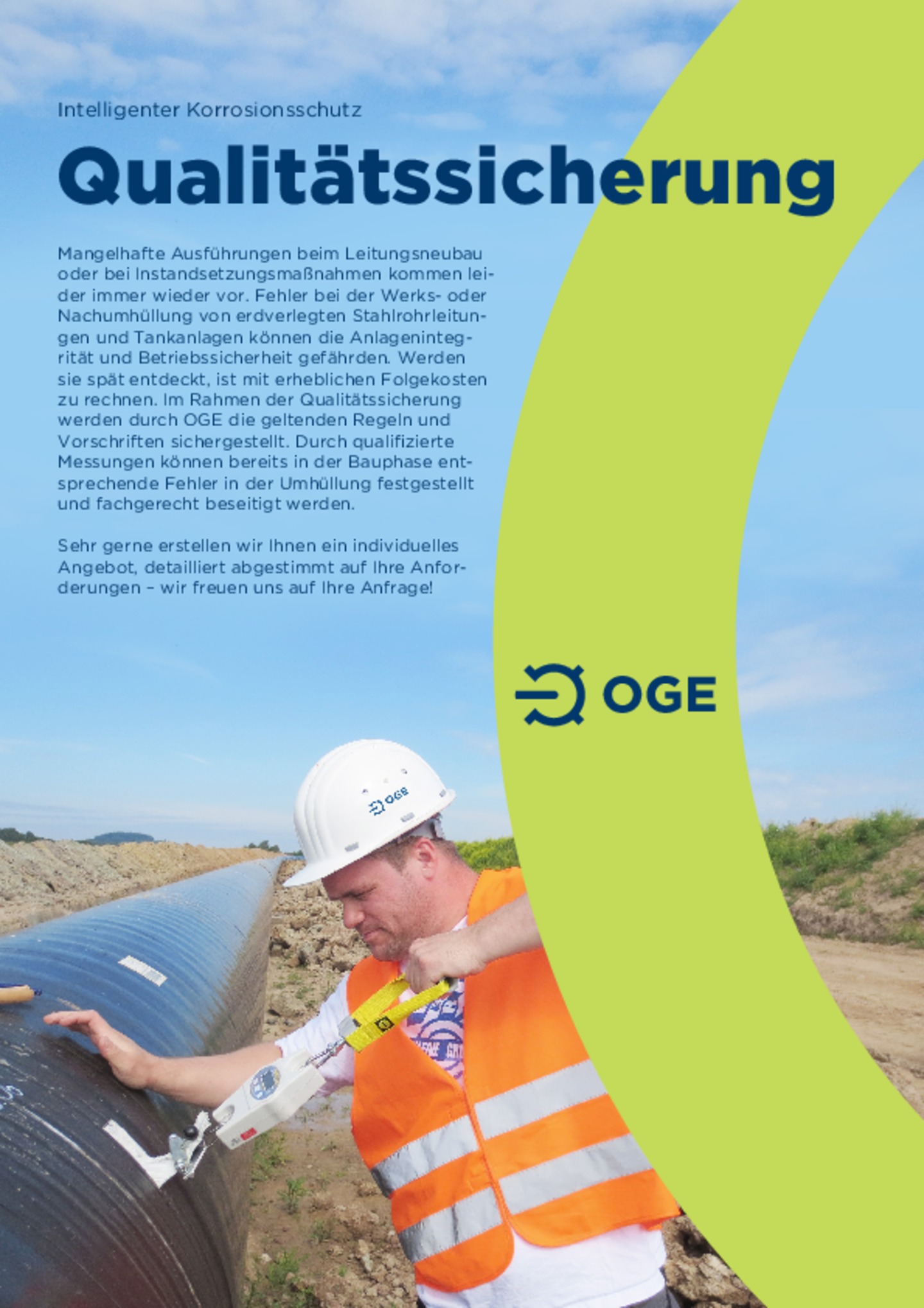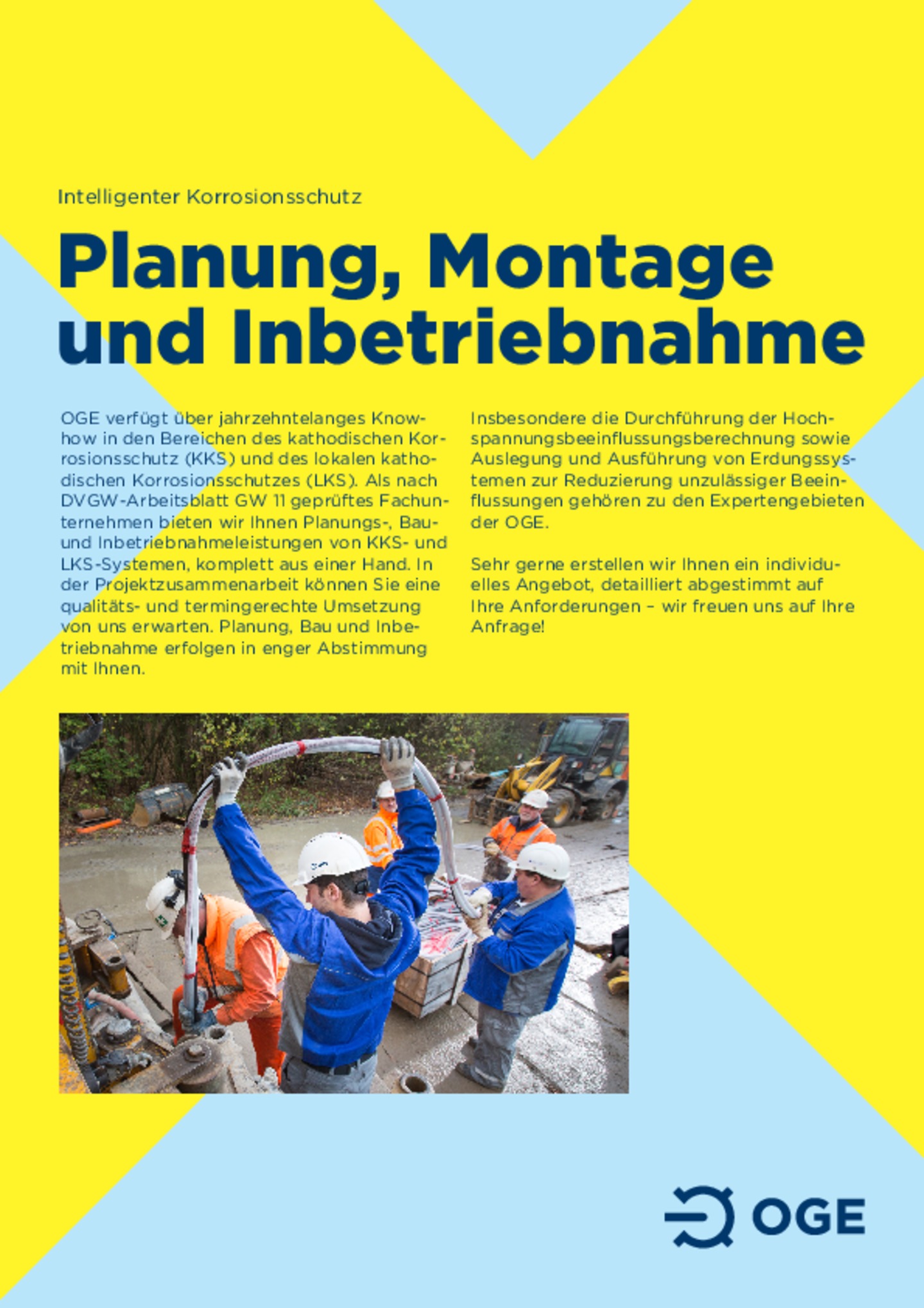 As a "corrosion protection pioneer", OGE is a specialist company certified to DVGW Code of Practice GW 11 which can support you in resolving your problems. The team includes experts accredited to DVGW Code of Practice GW 101, experts according to DIN EN 15257 Level 3 and Frosio-certified coating specialists.