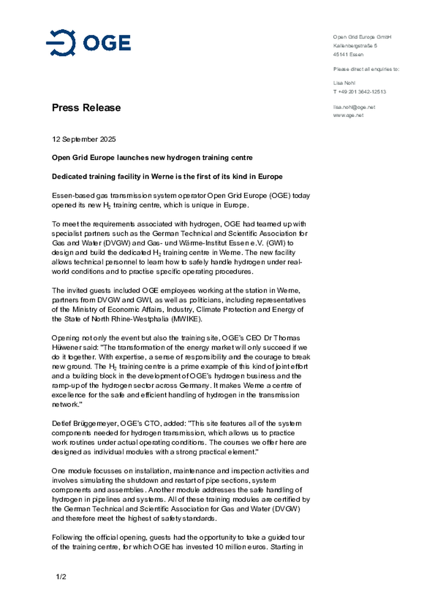 Dedicated training facility in Werne is the first of its kind in Europe. Essen-based gas transmission system operator Open Grid Europe (OGE) today opened its new H₂ training centre, which is unique …in Europe.