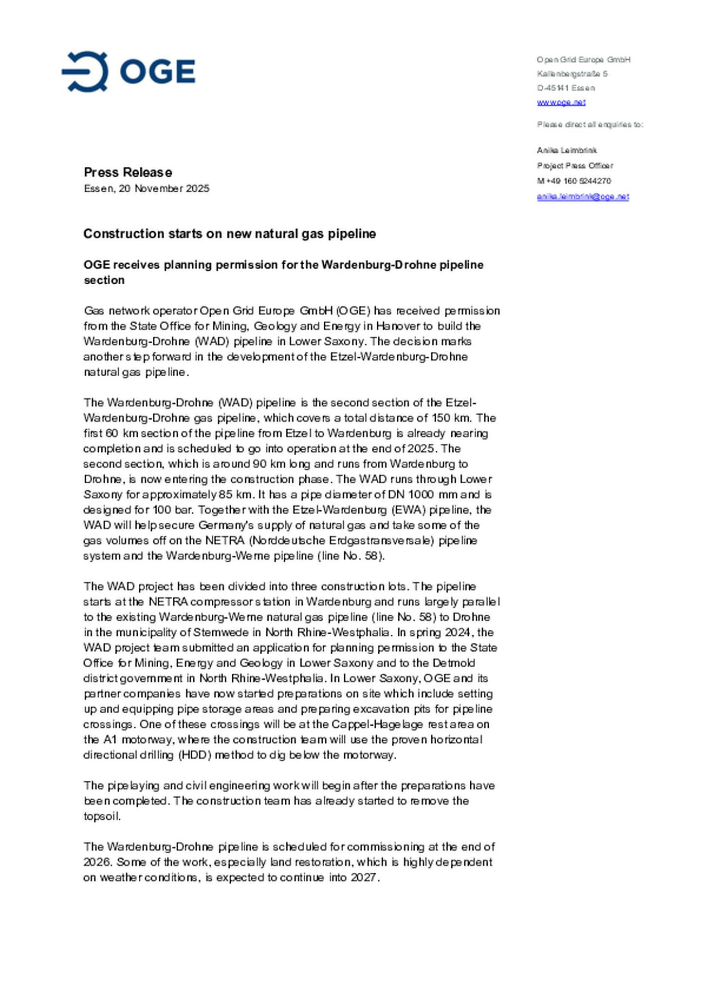 Upon receipt of the planning approval decision, OGE began preparatory construction work in Lower Saxony, such as preparing and equipping the pipe storage sites.