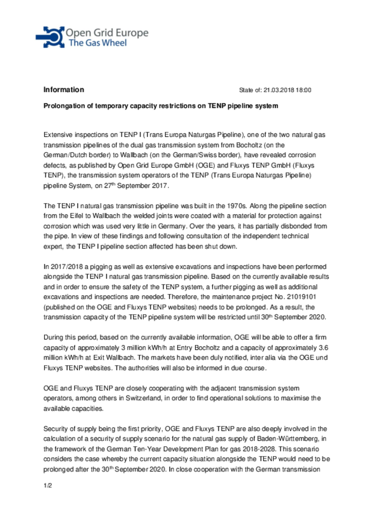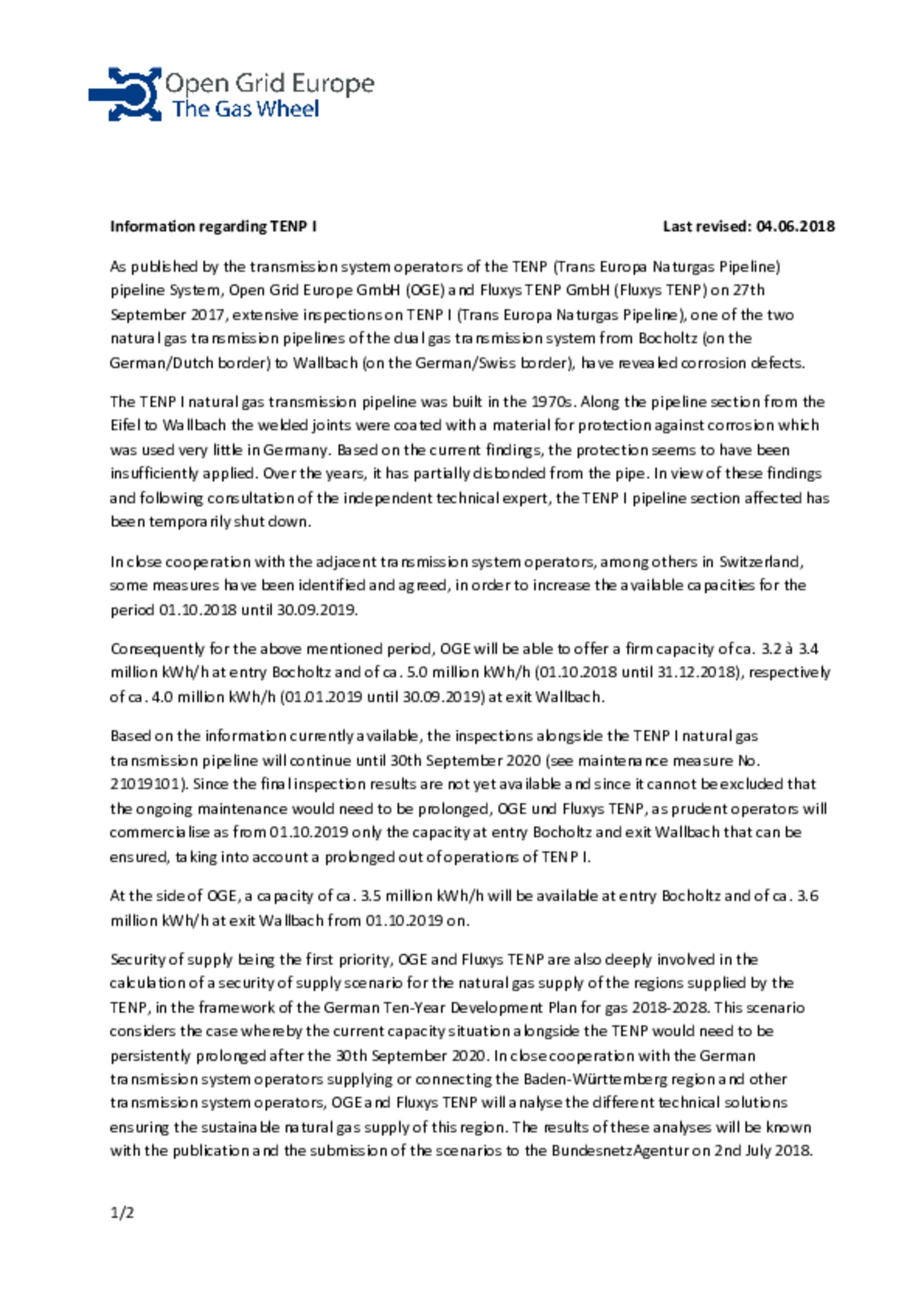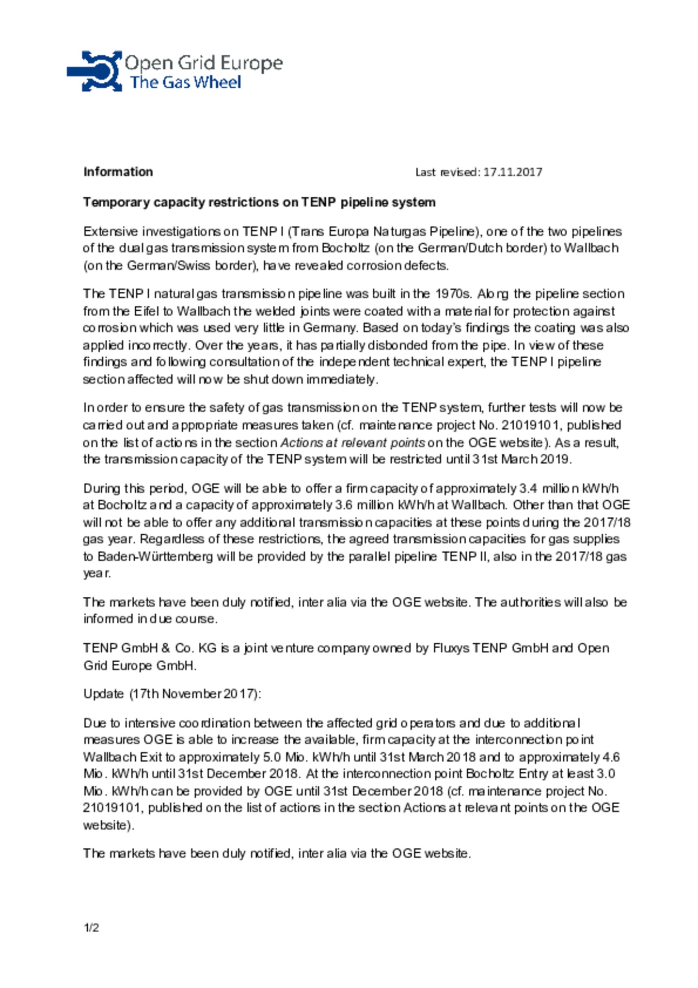 NCG Amendment to price sheet of Open Grid Europe GmbH 2019