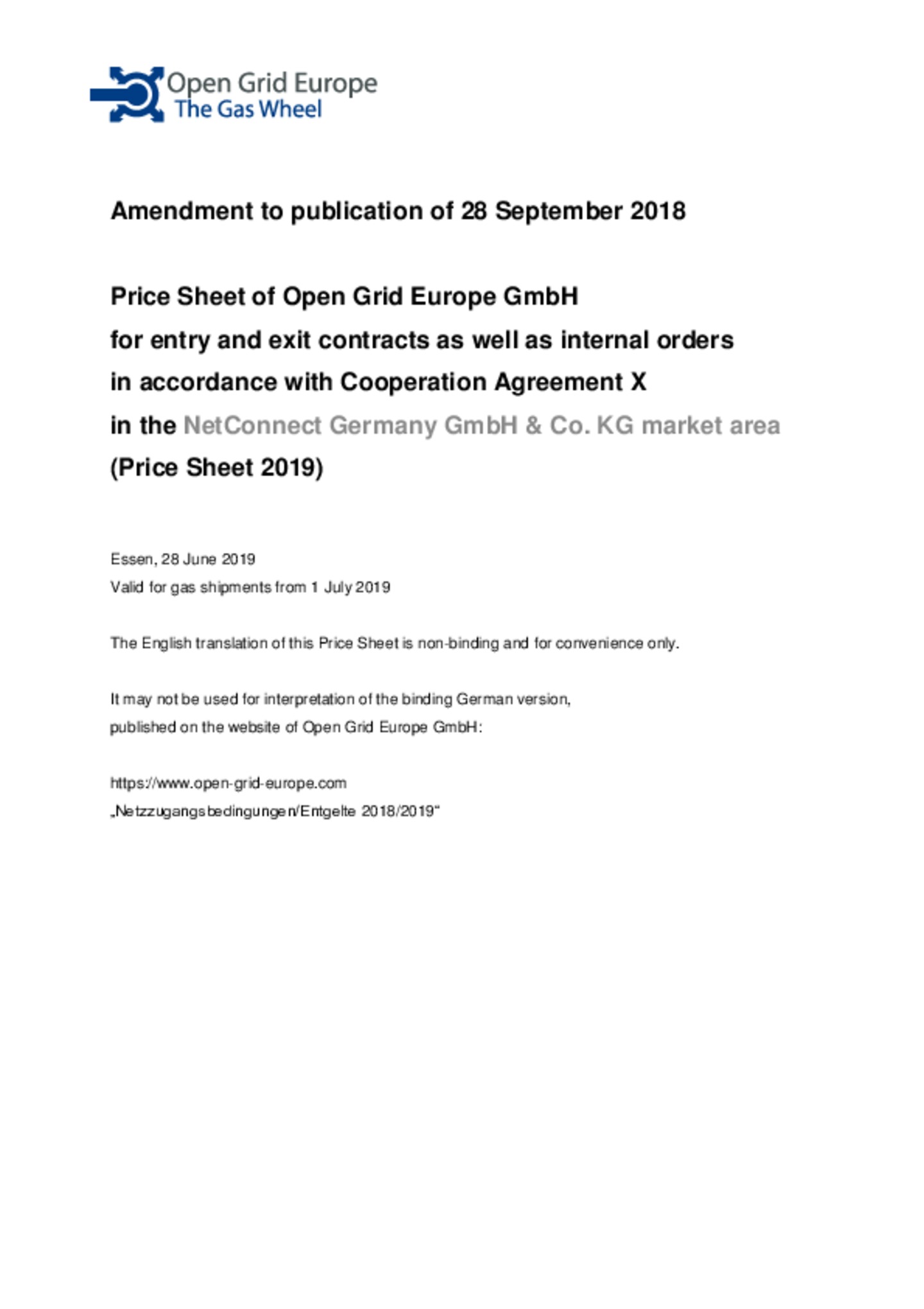 Amendment to publication of 28 September 2018. Price sheet for entry and exit contracts and internal orders pursuant to Cooperation Agreement X.2 in the market area of NetConnect Germany GmbH & Co. …KG, valid for shipments from 01.06.2019