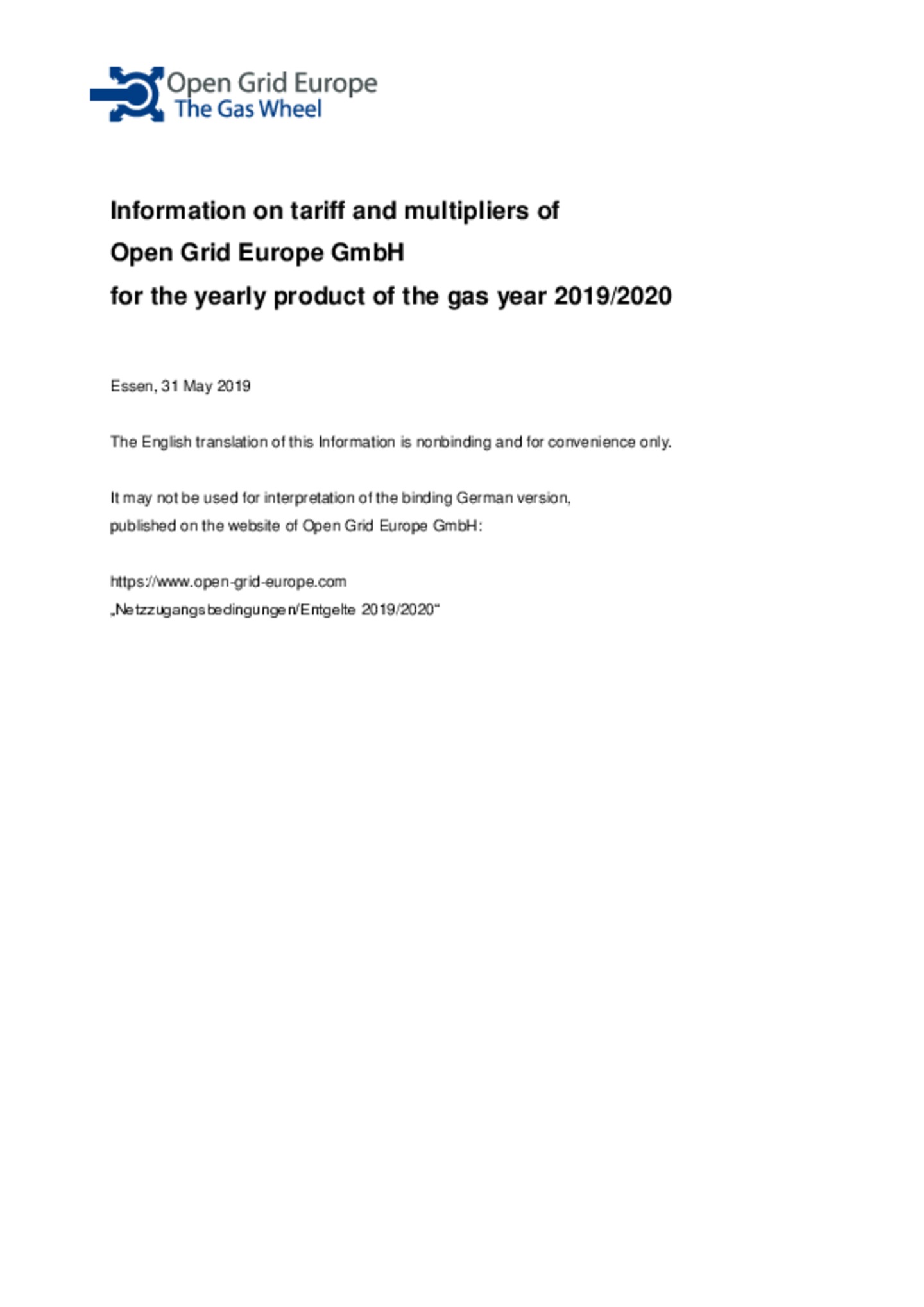 NCG Price sheet of Open Grid Europe GmbH 2020
