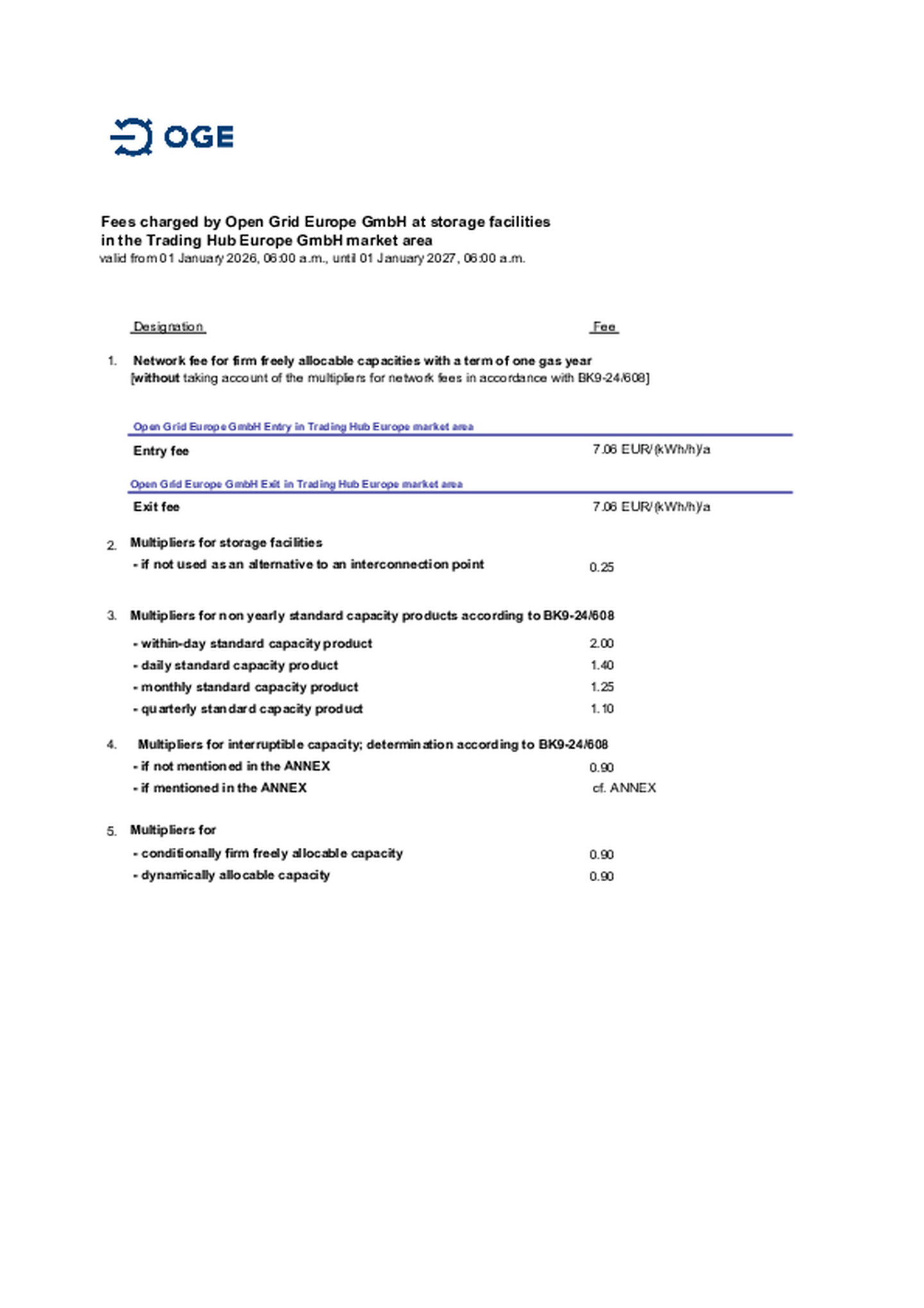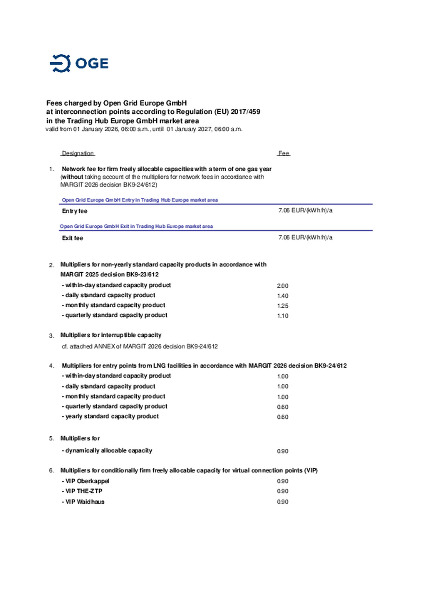 Price Sheet of Open Grid Europe GmbH for entry and exit contracts as well as internal orders in accordance with Cooperation Agreement XIII.1 in the market area Trading Hub Europe GmbH