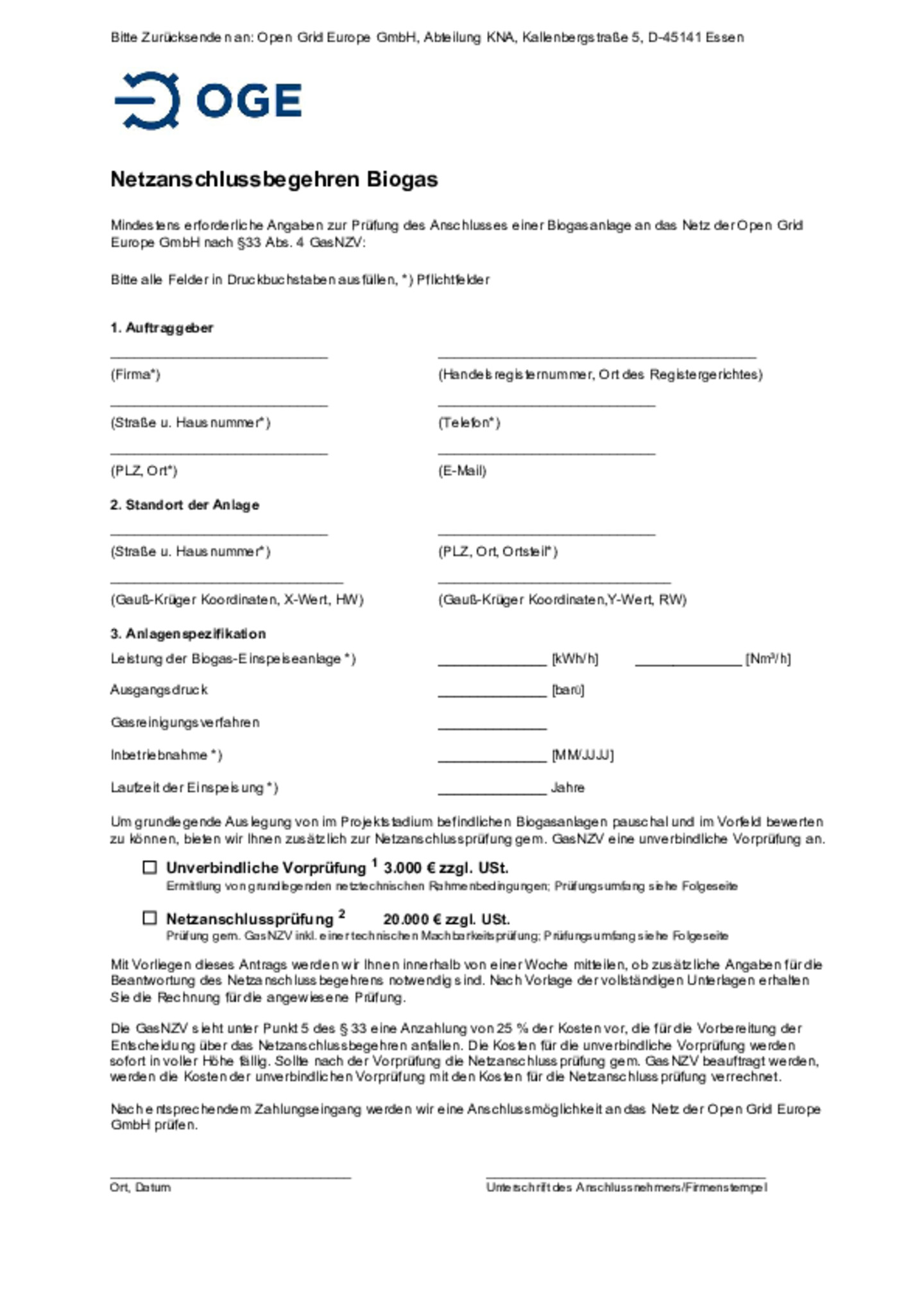 Open Grid Europe bietet seinen Transportkunden ein Formular zur effizienten Abwicklung von Anfragen nach § 38 GasNZV an. Durch die Verwendung des Formulars soll sichergestellt werden, dass Open Grid …Europe zeitnah über sämtliche Informationen verfügt, die für eine zügige Bearbeitung Ihrer Anfrage benötigt werden.