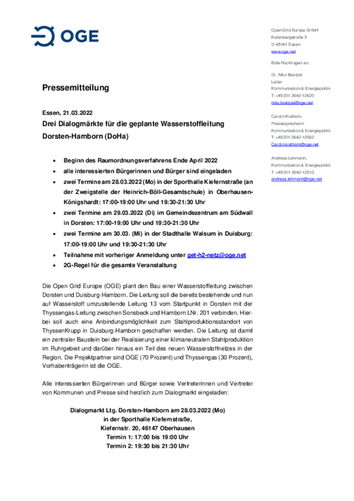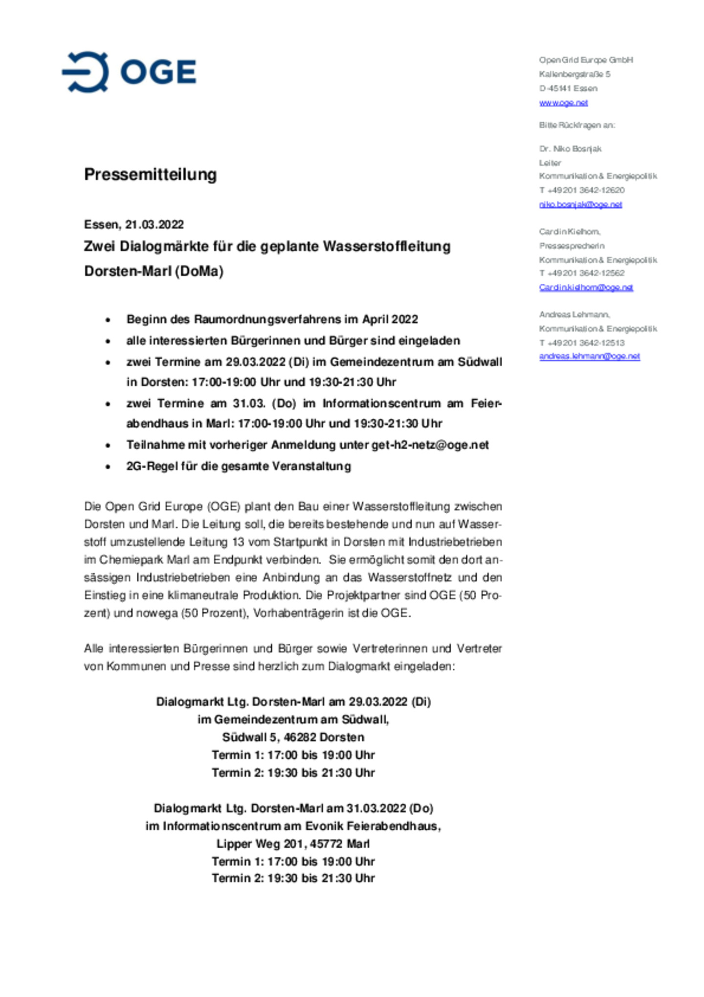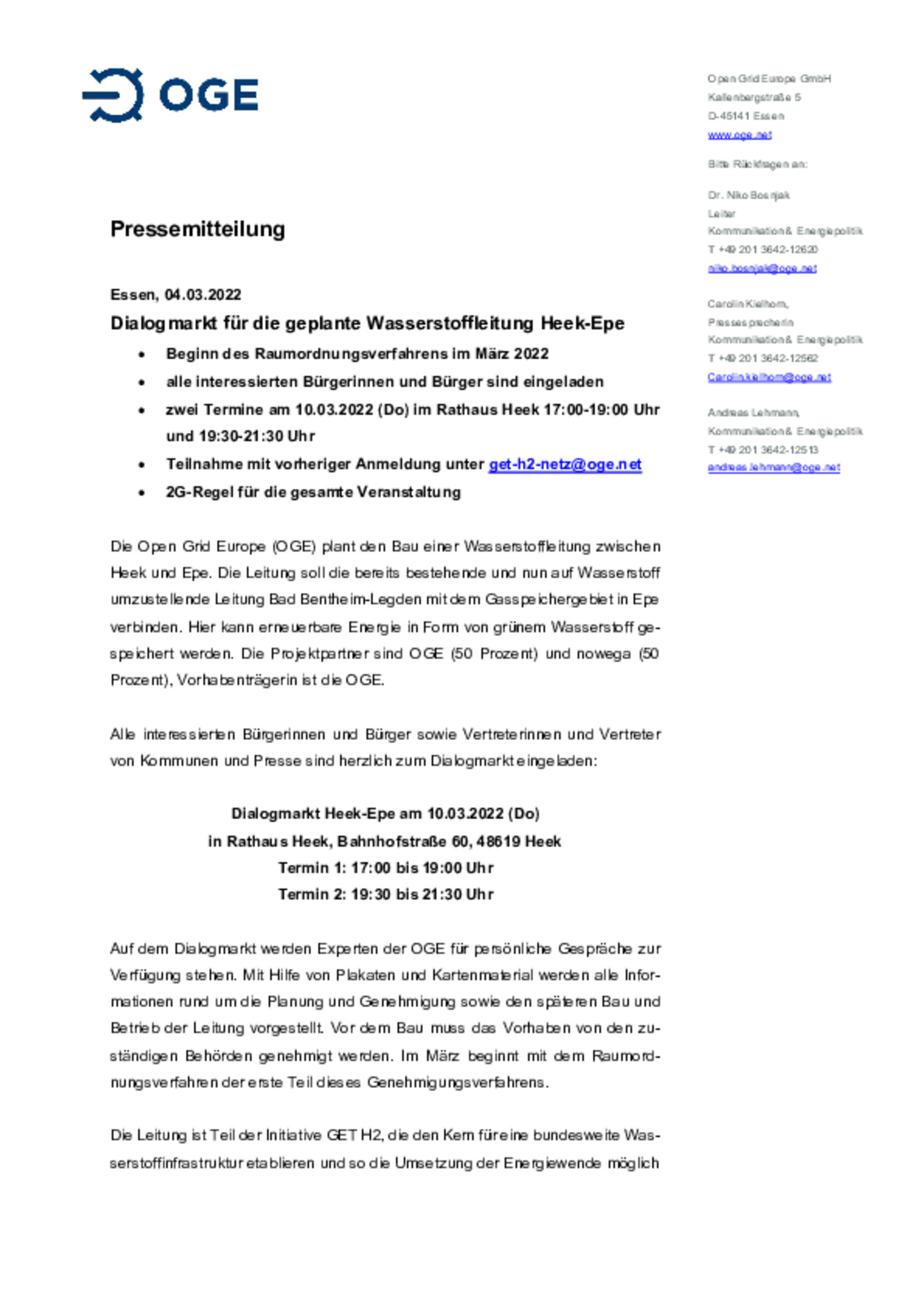 Essen, 19.05.2022. Zur Erreichung der ambitionierten Klimaziele ist im Mobilitätssektor, vor allem im Güterverkehr, der Wechsel auf einen klimafreundlichen Treibstoff unumgänglich. Um diesen Wechsel …zu ermöglichen, haben das schweizerische Unternehmen H2 Energy Europe AG (H2 Energy) und die in Essen ansässige Open Grid Europe GmbH (OGE) eine Absichtserklärung über folgendes Konzept geschlossen.