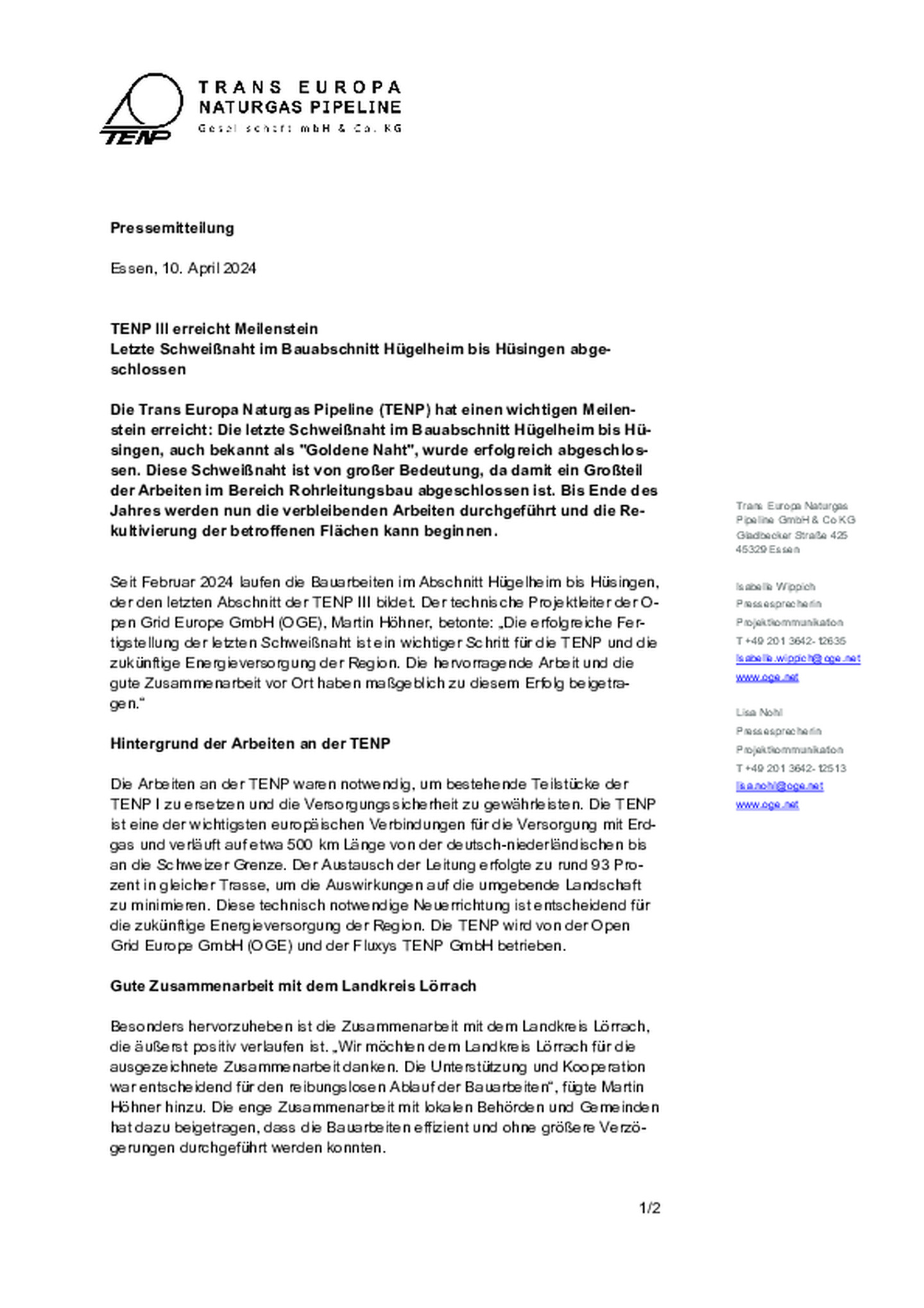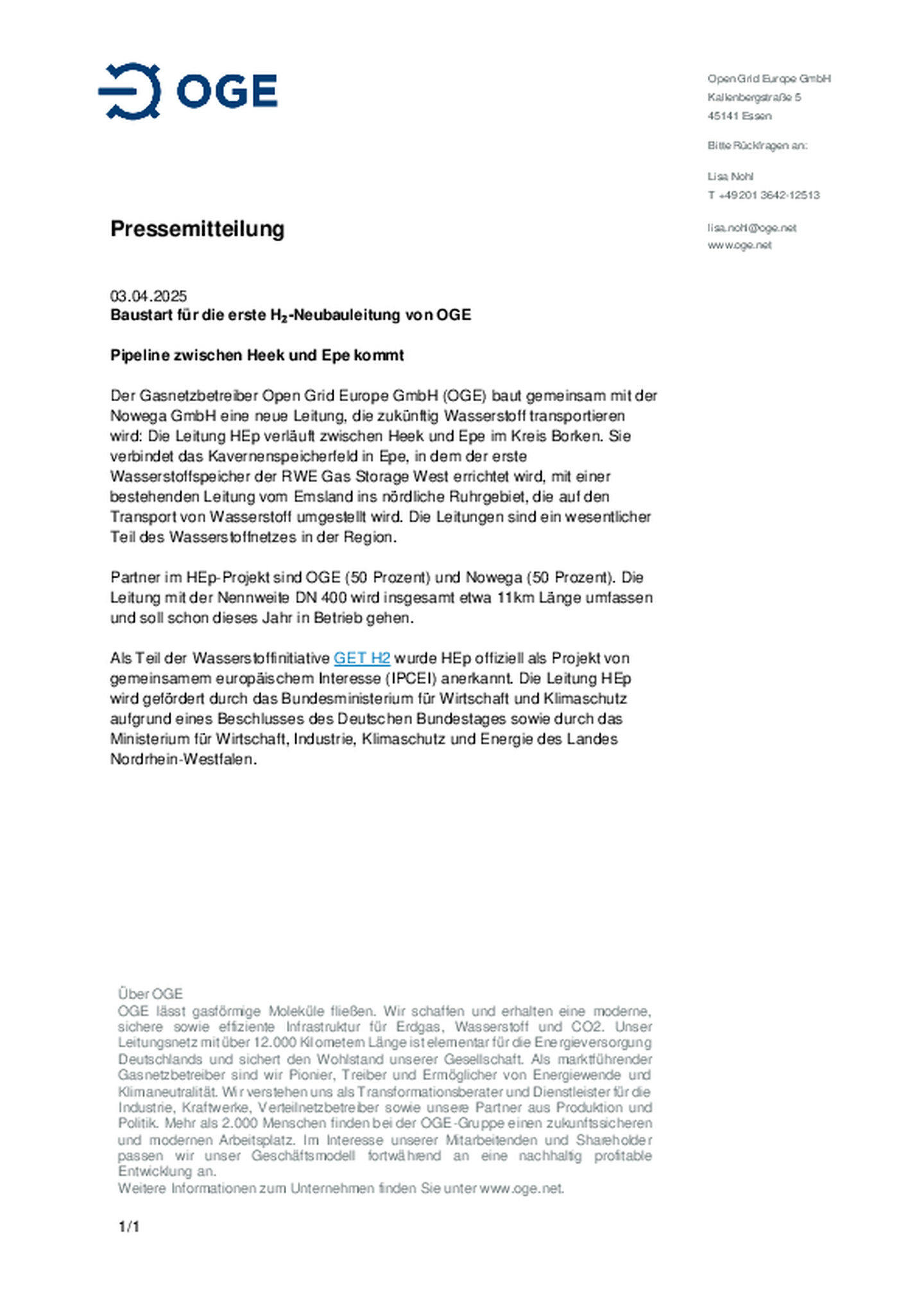 Der Gasnetzbetreiber Open Grid Europe GmbH (OGE) baut gemeinsam mit der Nowega GmbH eine neue Leitung, die zukünftig Wasserstoff transportieren wird: Die Leitung HEp verläuft zwischen Heek und Epe im… Kreis Borken.