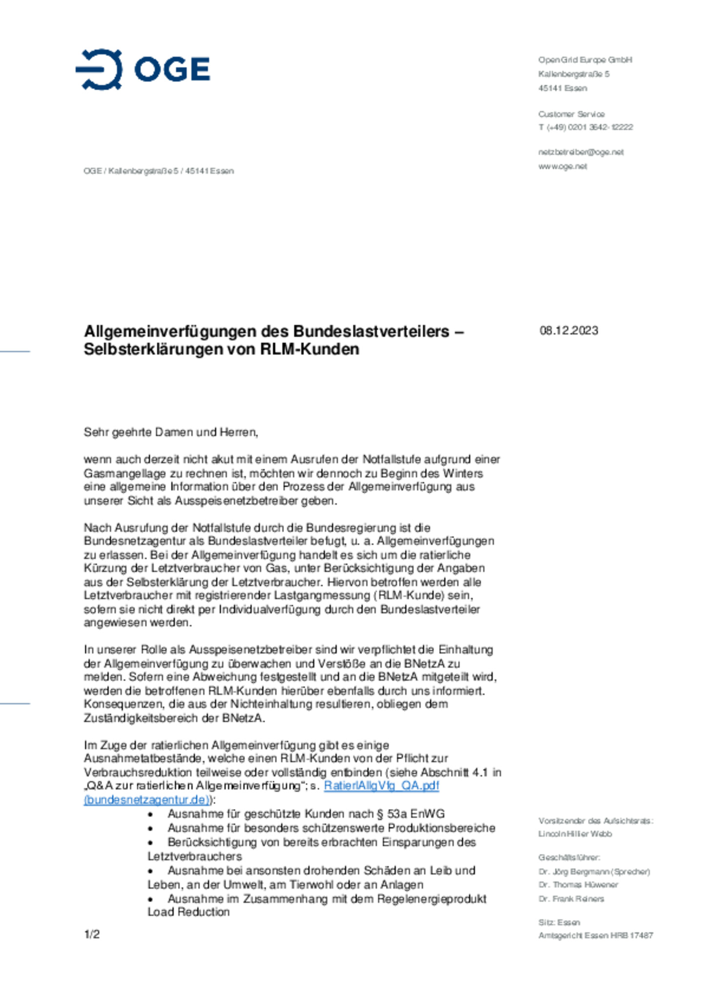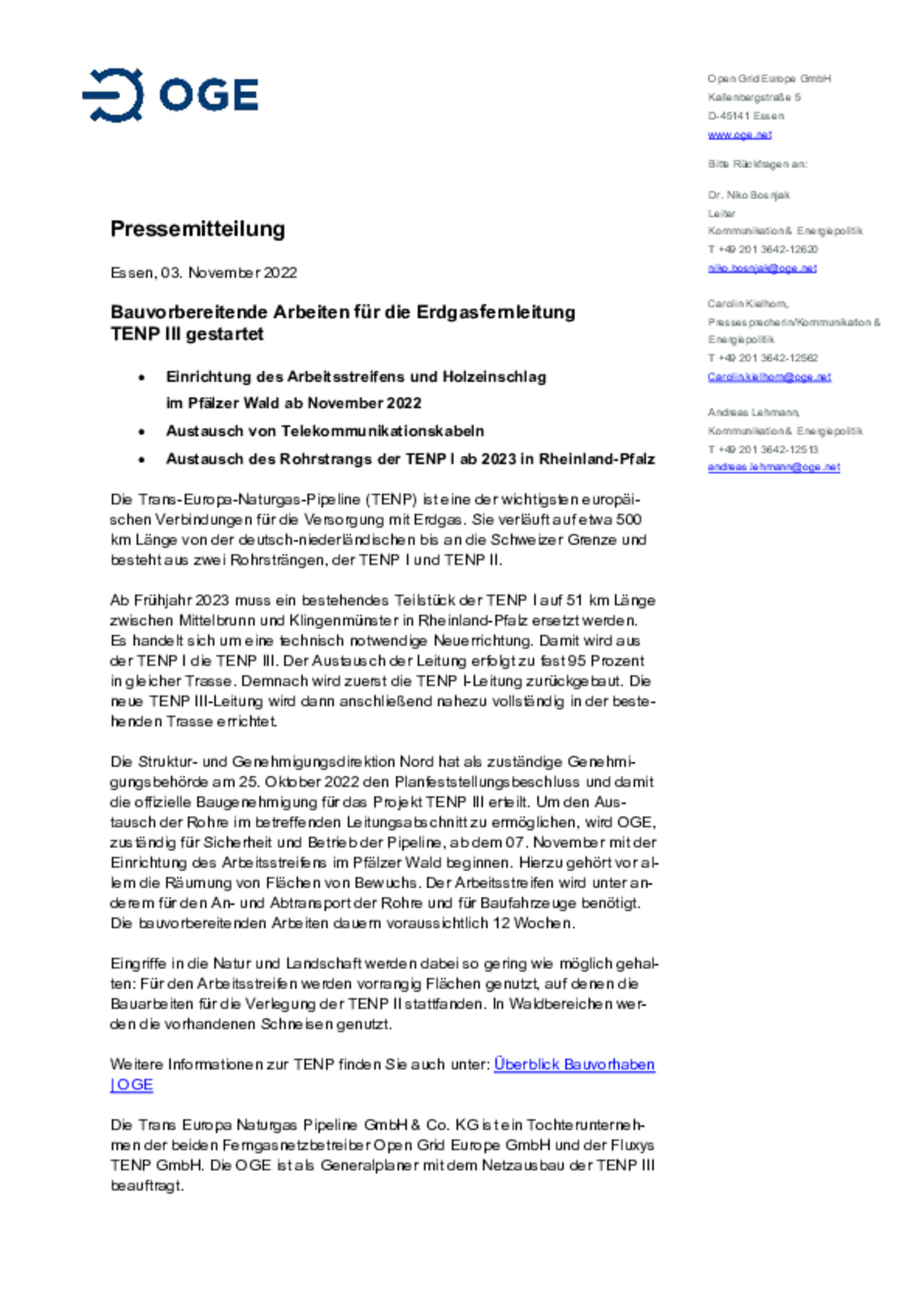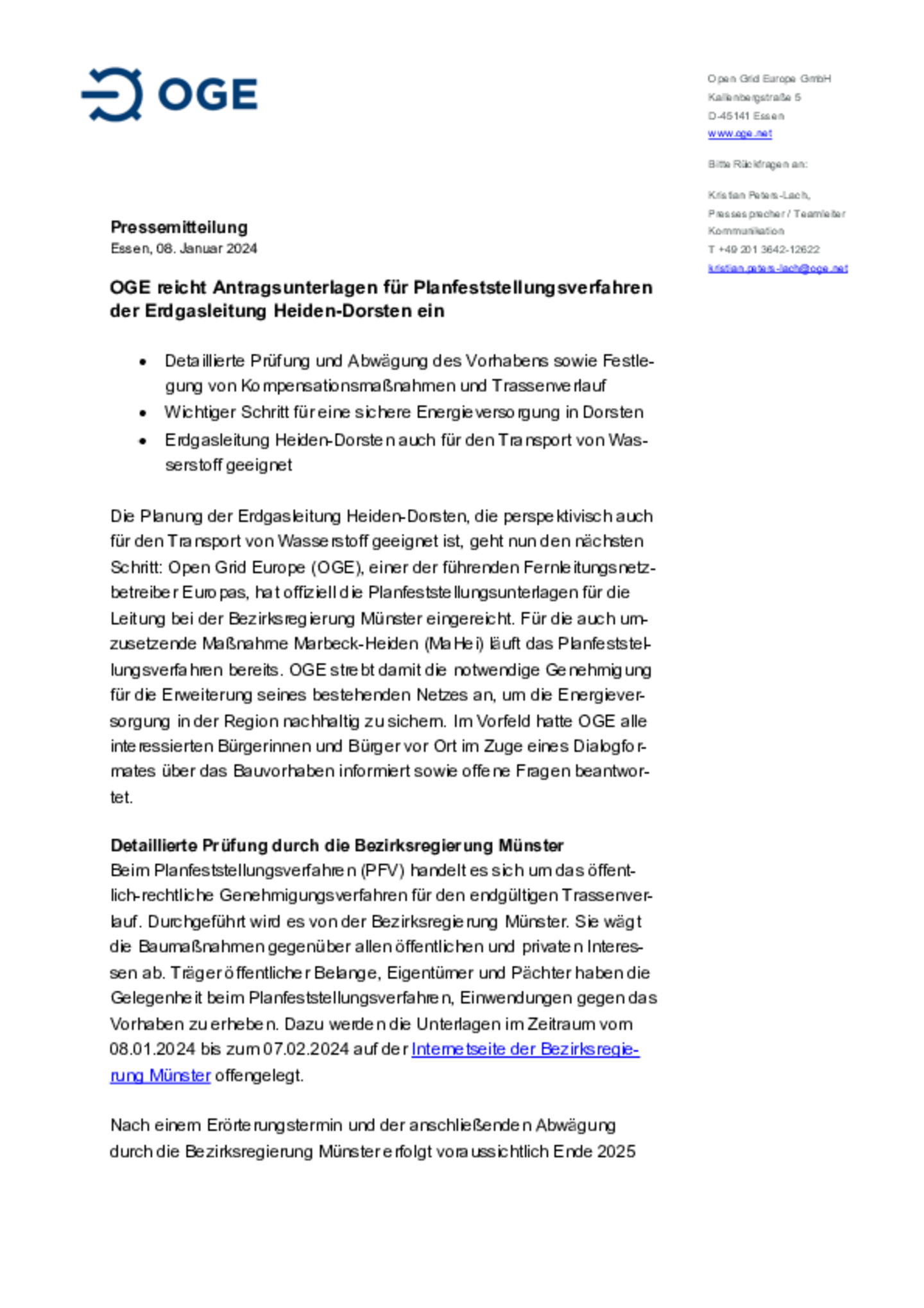 OGE hat offiziell die Planfeststellungsunterlagen für die – auch für den perspektivischen Transport für Wasserstoff geeignete – Erdgasleitung Marbeck-Heiden bei der Bezirksregierung Münster …eingereicht.