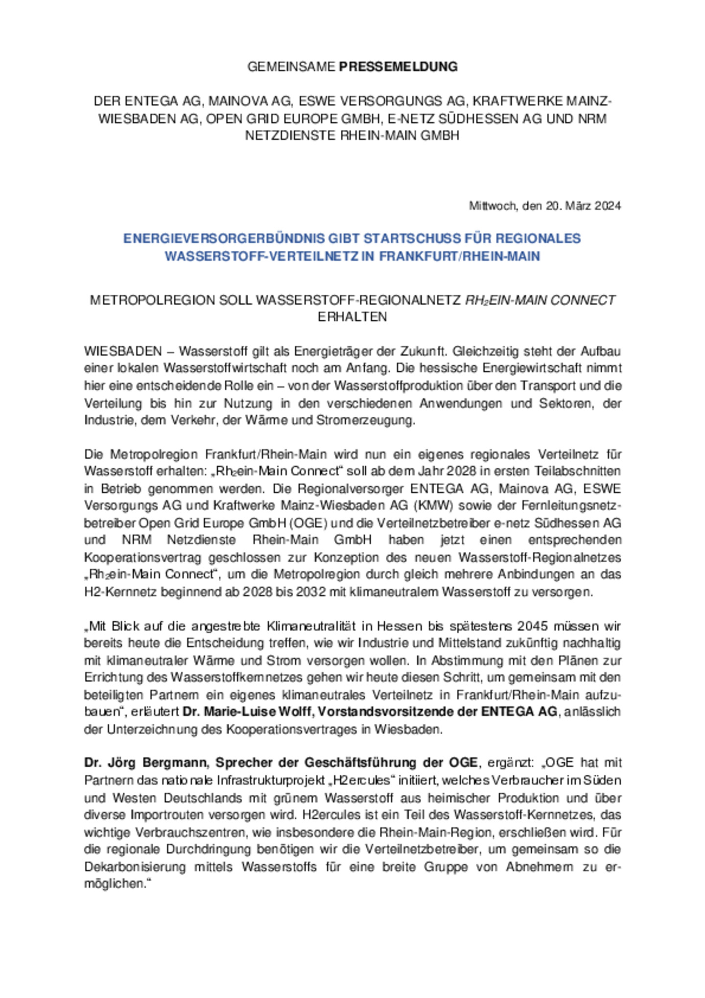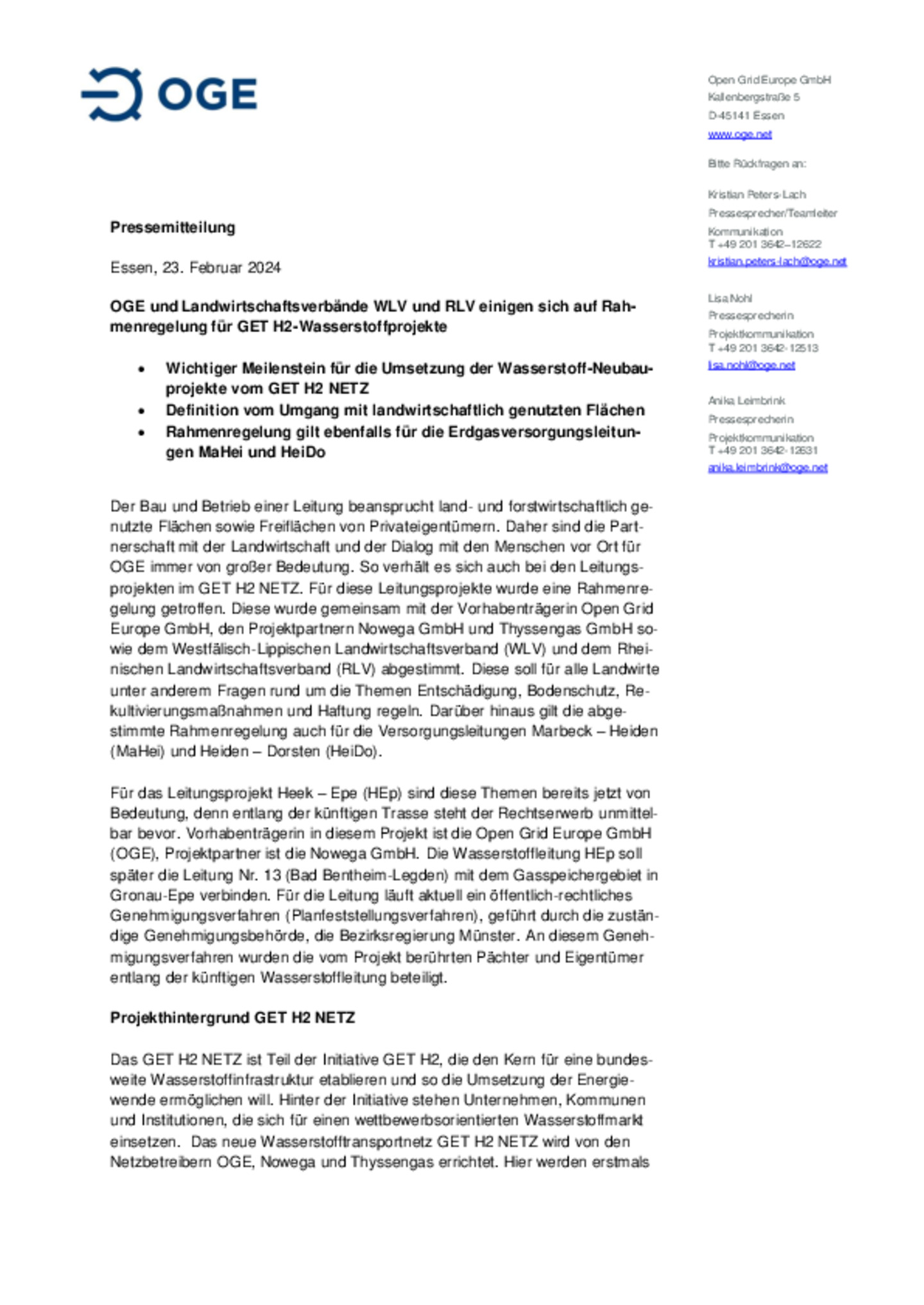 OGE und Landwirtschaftsverbände WLV und RLV einigen sich auf Rahmenregelung für GET H2-Wasserstoffprojekte