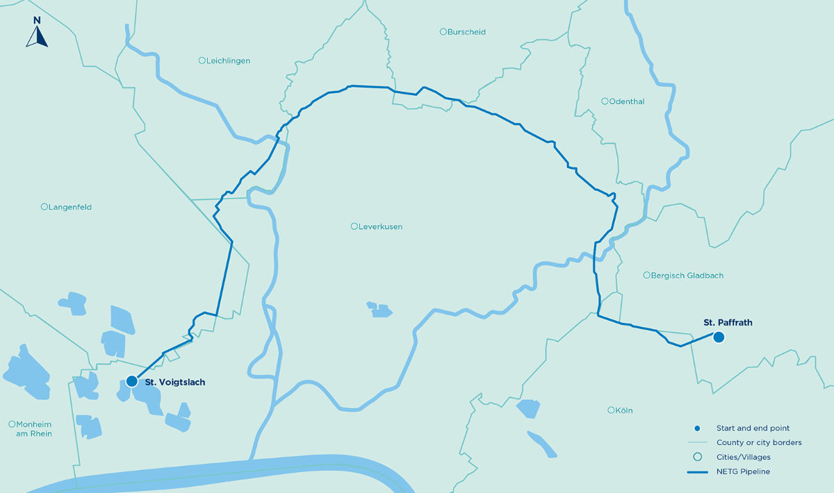 The 23.6 km NETG transmission pipeline connects the Voigtslach valve station in Leverkusen Hitdorf with the Paffrath station in the municipality of Bergisch Gladbach.