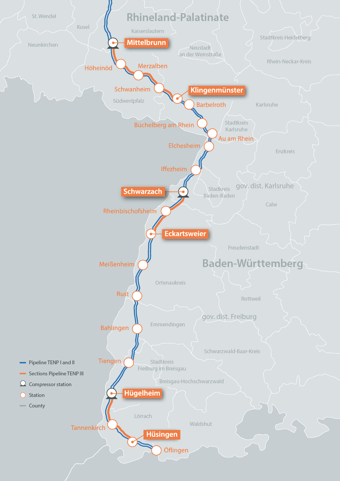 Introductory text: TENP is one of Europe's most important natural gas connections. It runs from the German-Dutch border to the Swiss border.