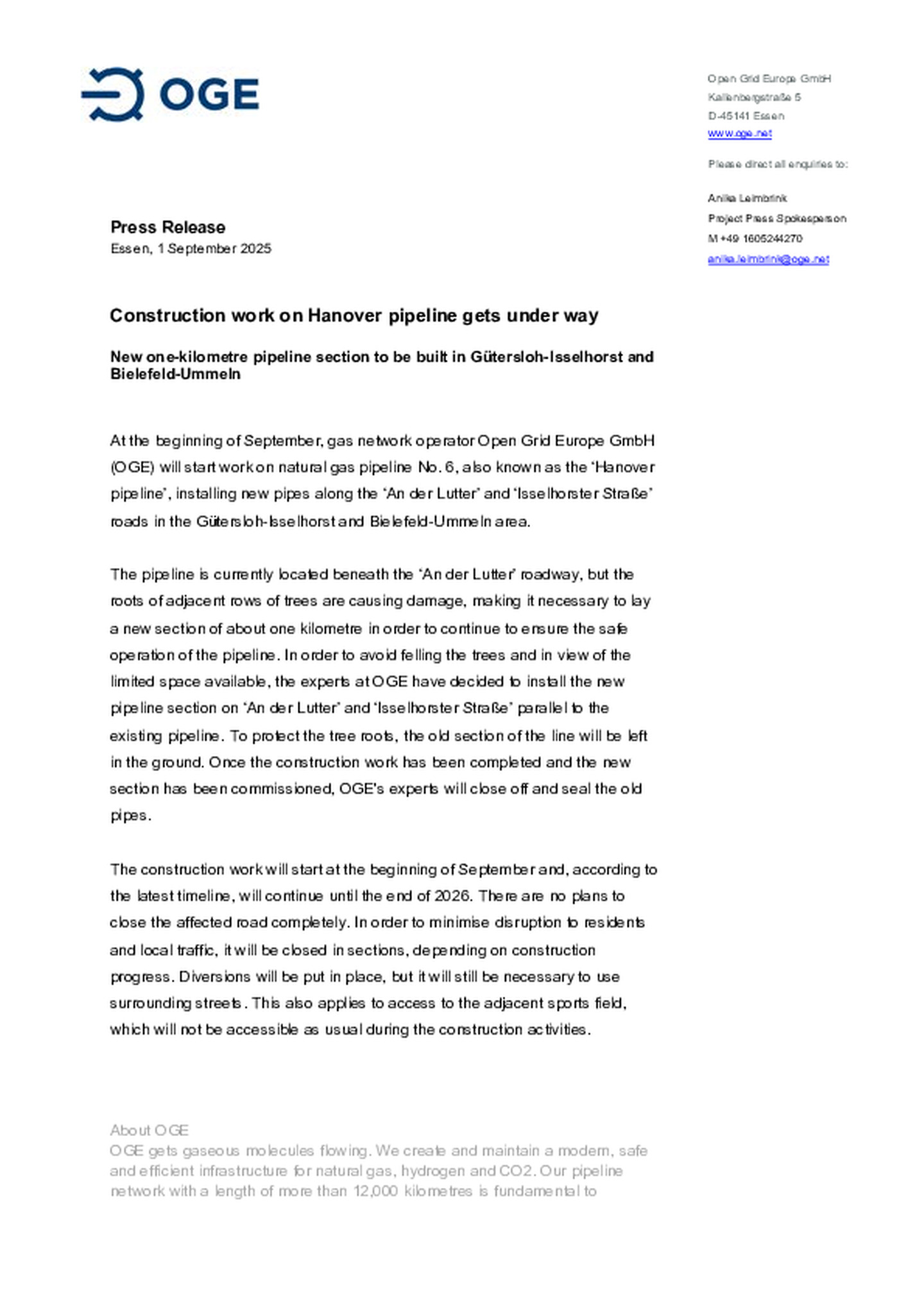 This price sheet is part of the General Terms and Conditions for Entry/Exit Contracts Governing the Transportation of Hydrogen in the GET H2 Network of Multiple Network Operators in the currently …valid version (GTC). Valid for hydrogen transports from commissioning of the first part of the GET H2 Network of Open Grid Europe GmbH (expected in Q1 2026). Status 17 July 2025
