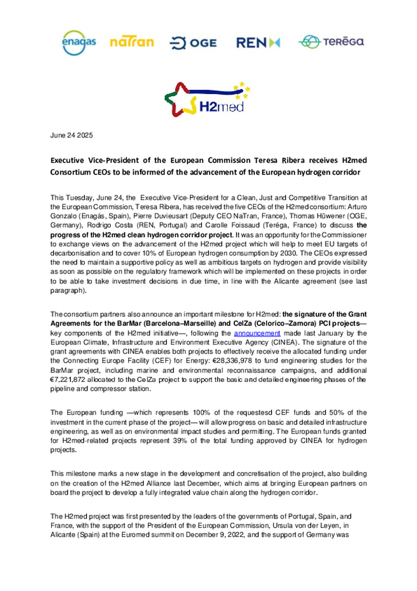 This Tuesday, June 24, the Executive Vice-President for a Clean, Just and Competitive Transition at the European Commission, Teresa Ribera, has received the five CEOs of the H2med consortium: Arturo …Gonzalo (Enagás, Spain), Pierre Duvieusart (Deputy CEO NaTran, France), Thomas Hüwener (OGE, Germany), Rodrigo Costa (REN, Portugal) and Carolle Foissaud (Teréga, France) to discuss the progress of the H2med clean hydrogen corridor project