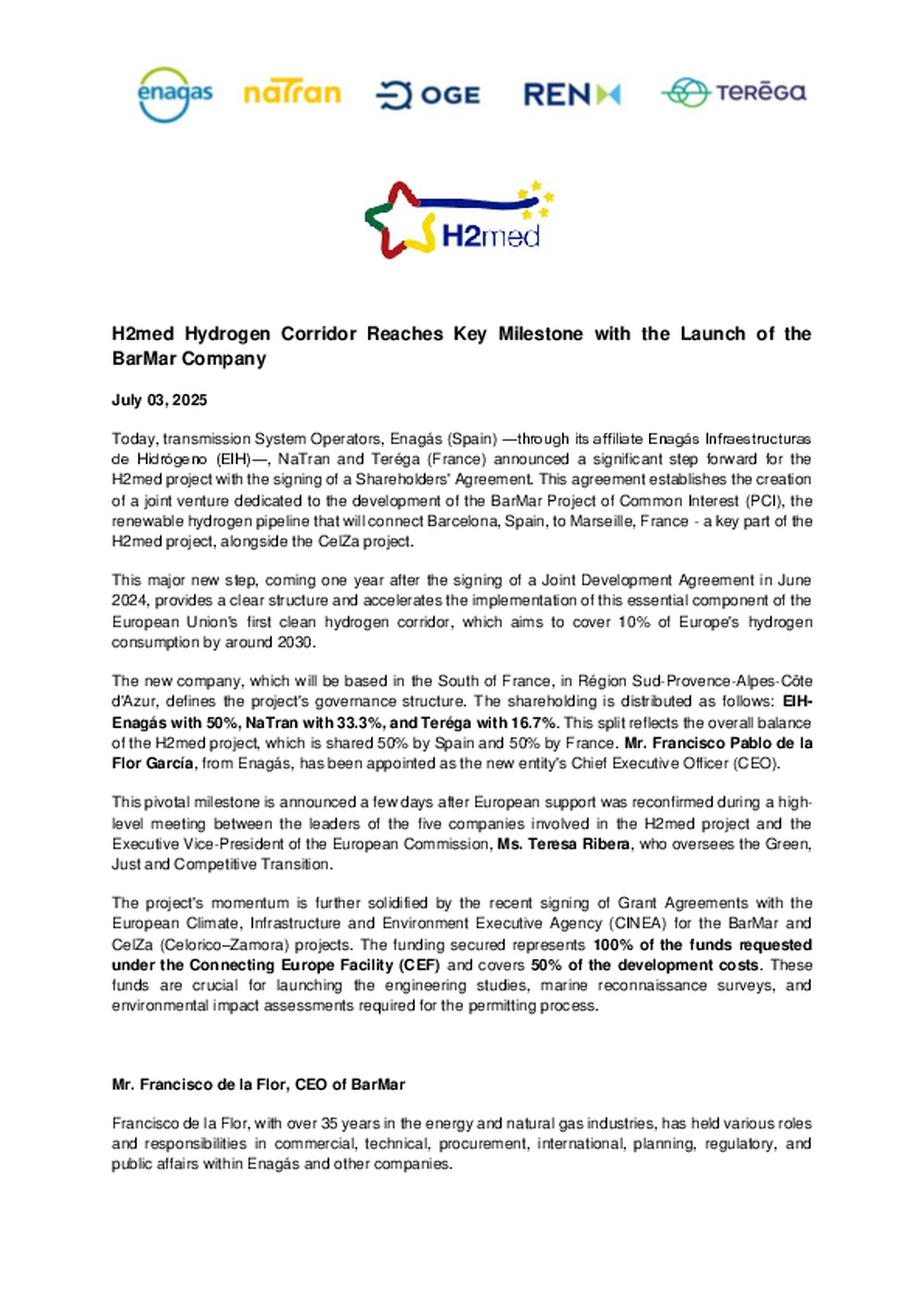 H2med Hydrogen Corridor Reaches Key Milestone with the Launch of the BarMar Company