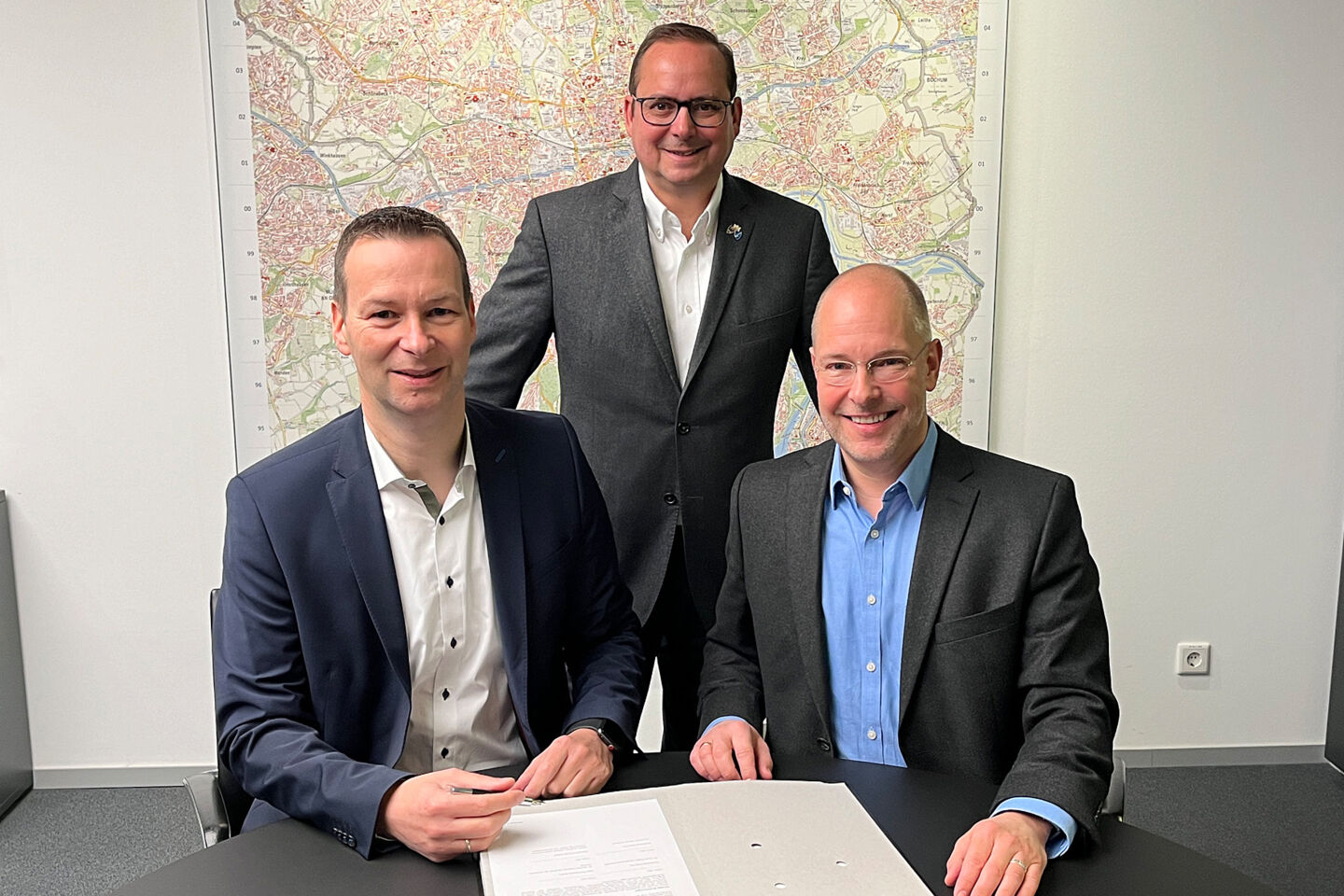 Signing the partnership agreement – from left: Dr. Thomas Hüwener, CEO of OGE, Thomas Kufen, Mayor of the City of Essen and Dr. Frank Pieper, CEO of Stadtwerke Essen.