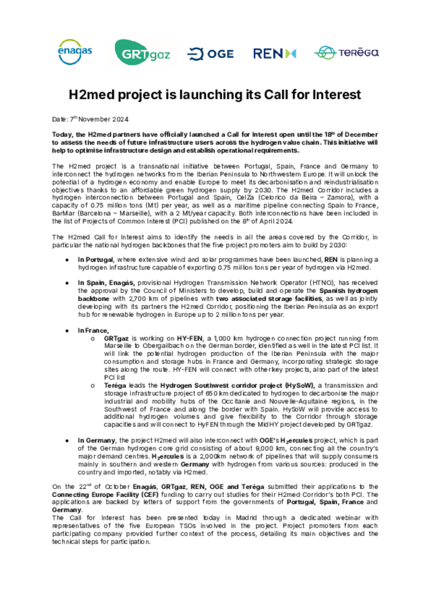 Today, the H2med partners have officially launched a Call for Interest open until the 18th of December to assess the needs of future infrastructure users across the hydrogen value chain. This i…nitiative will help to optimise infrastructure design and establish operational requirements.